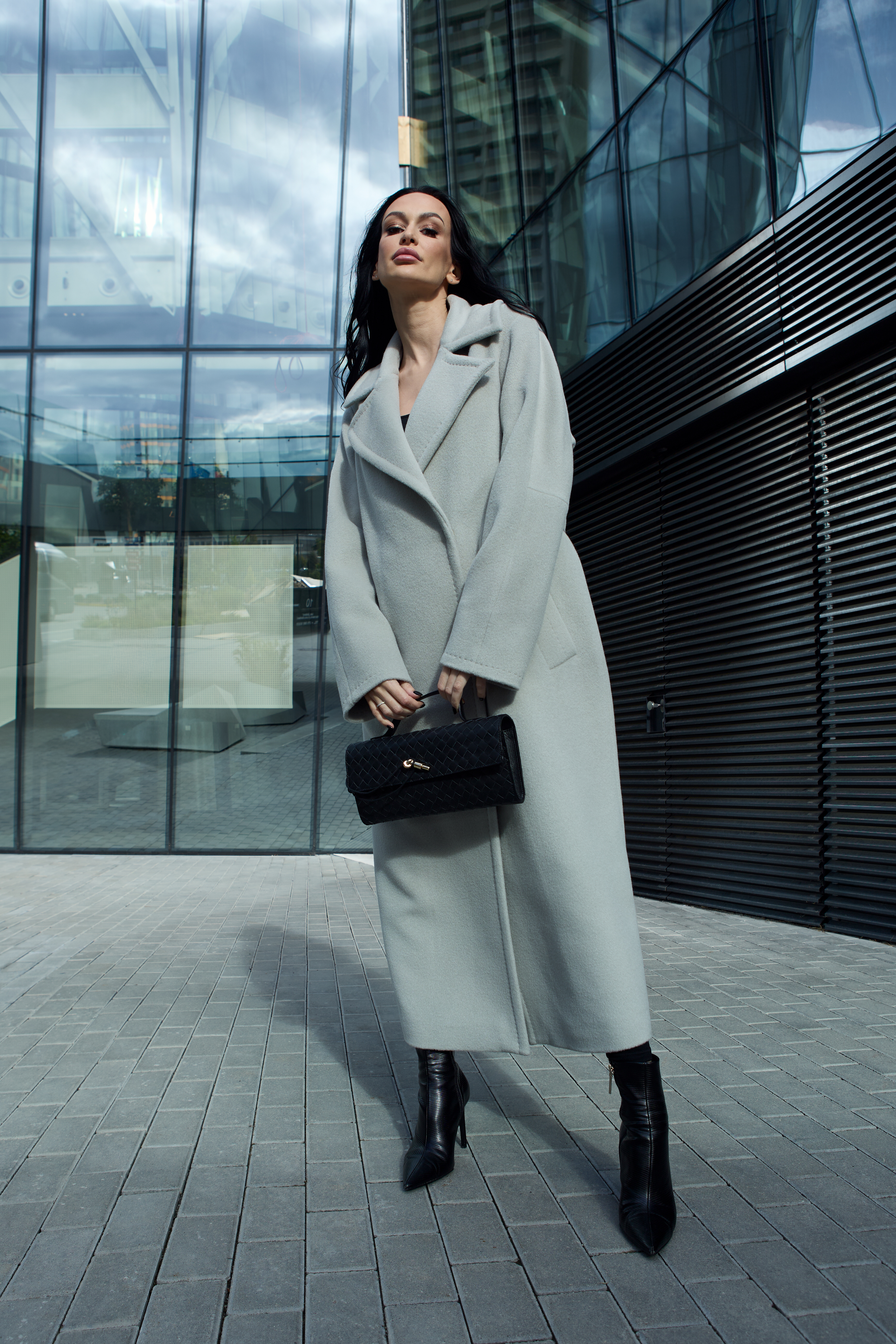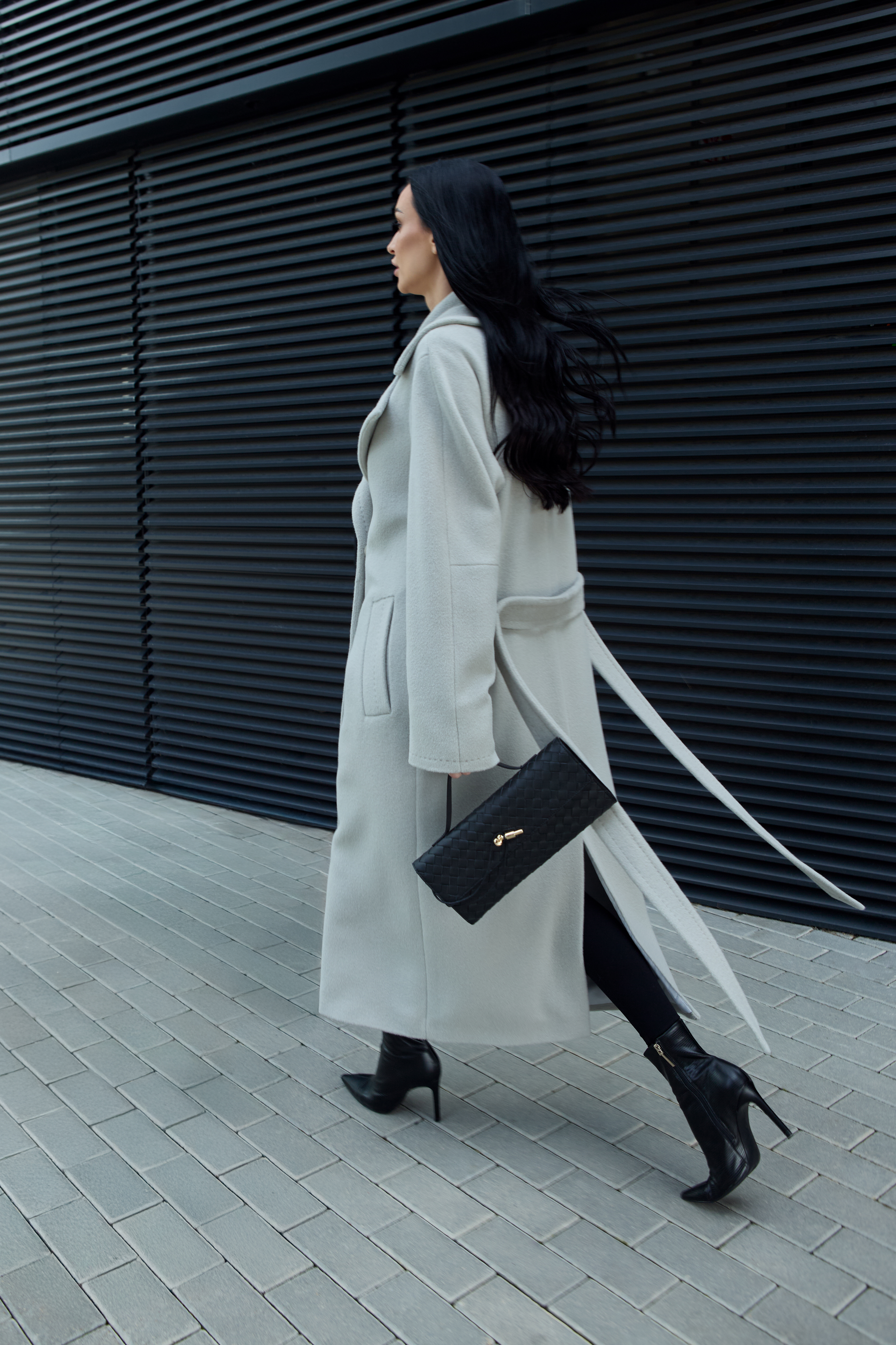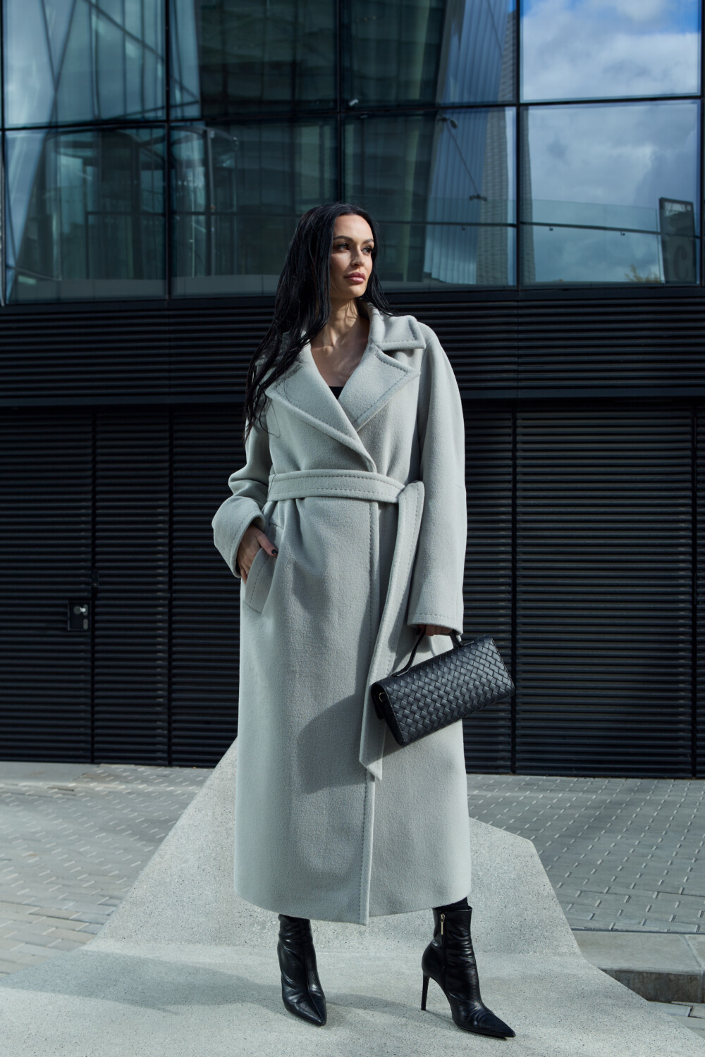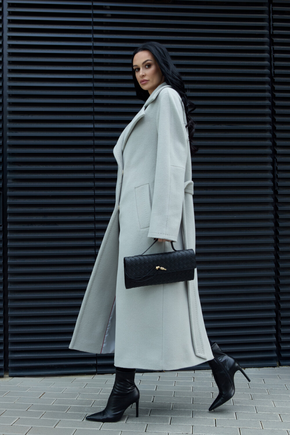 A long, straight-silhouette coat featuring an enlarged, pointed classic collar that adds elegance without restricting movement. The raglan-style sleeves provide a sense of comfort and freedom while flattering various shoulder shapes. The coat fastens with metal snaps and is cinched at the waist with a belt made from the same fabric.