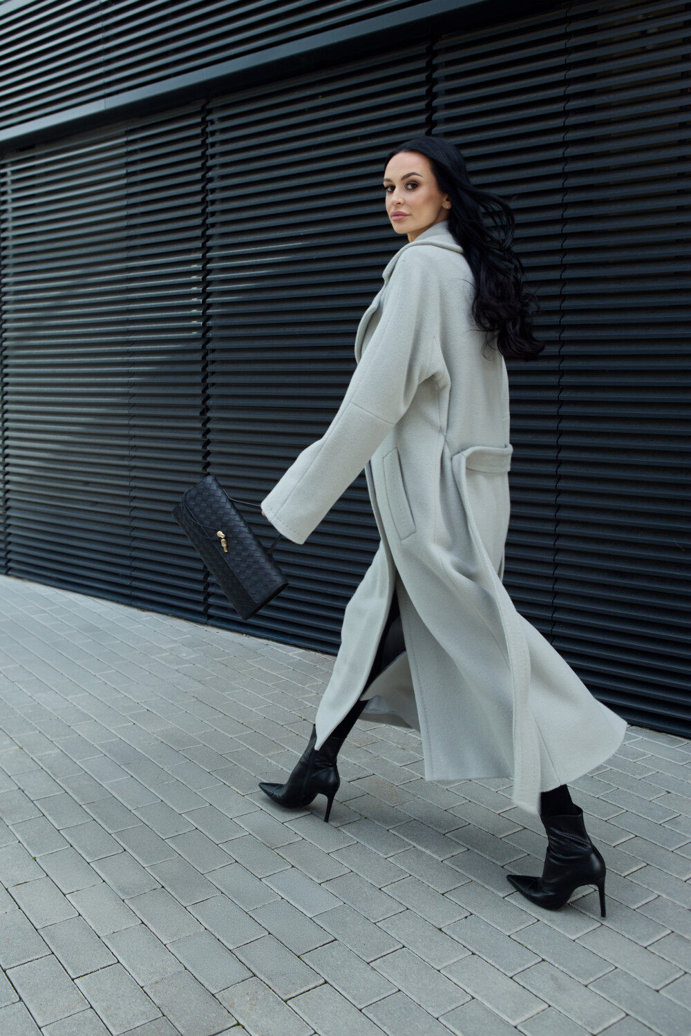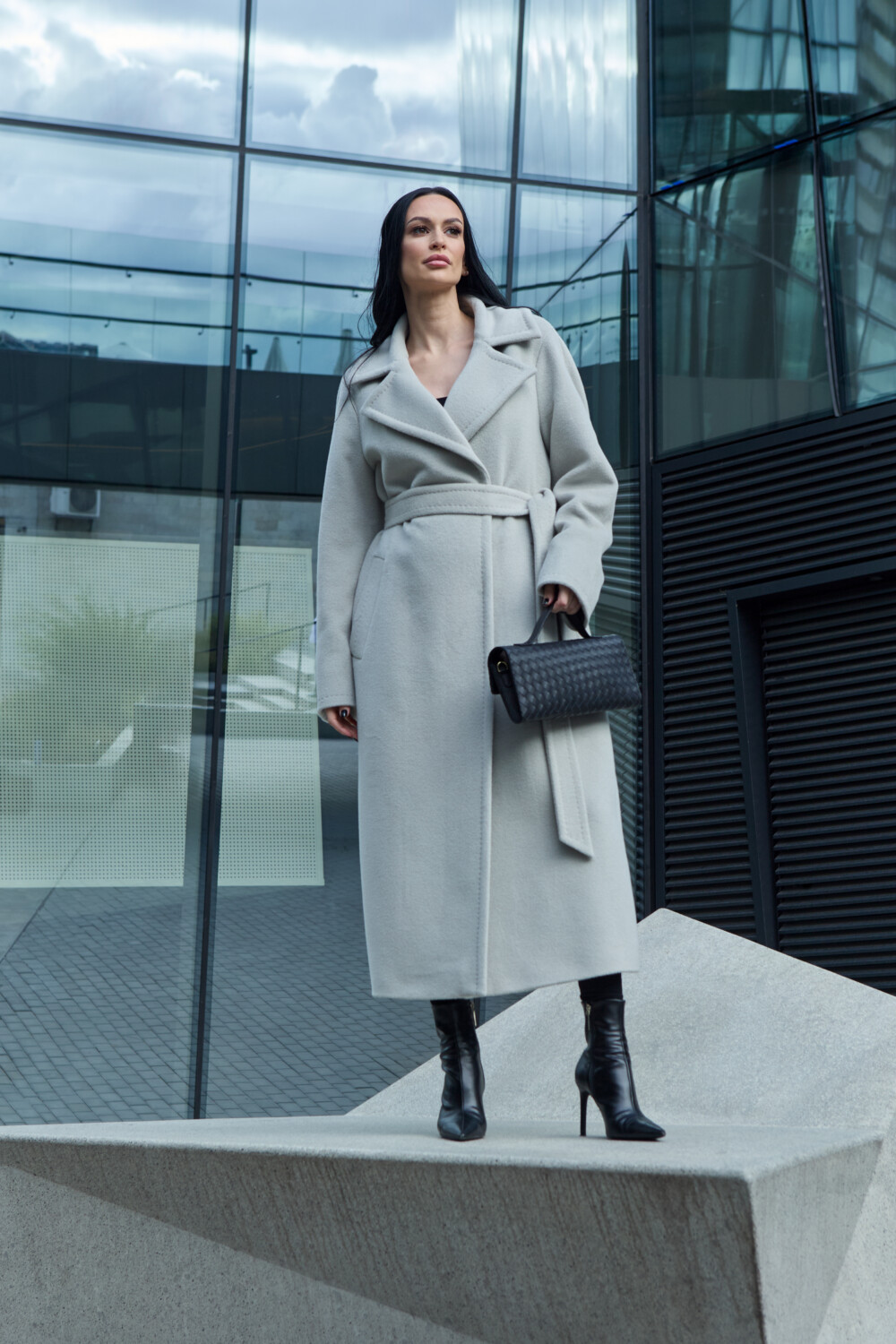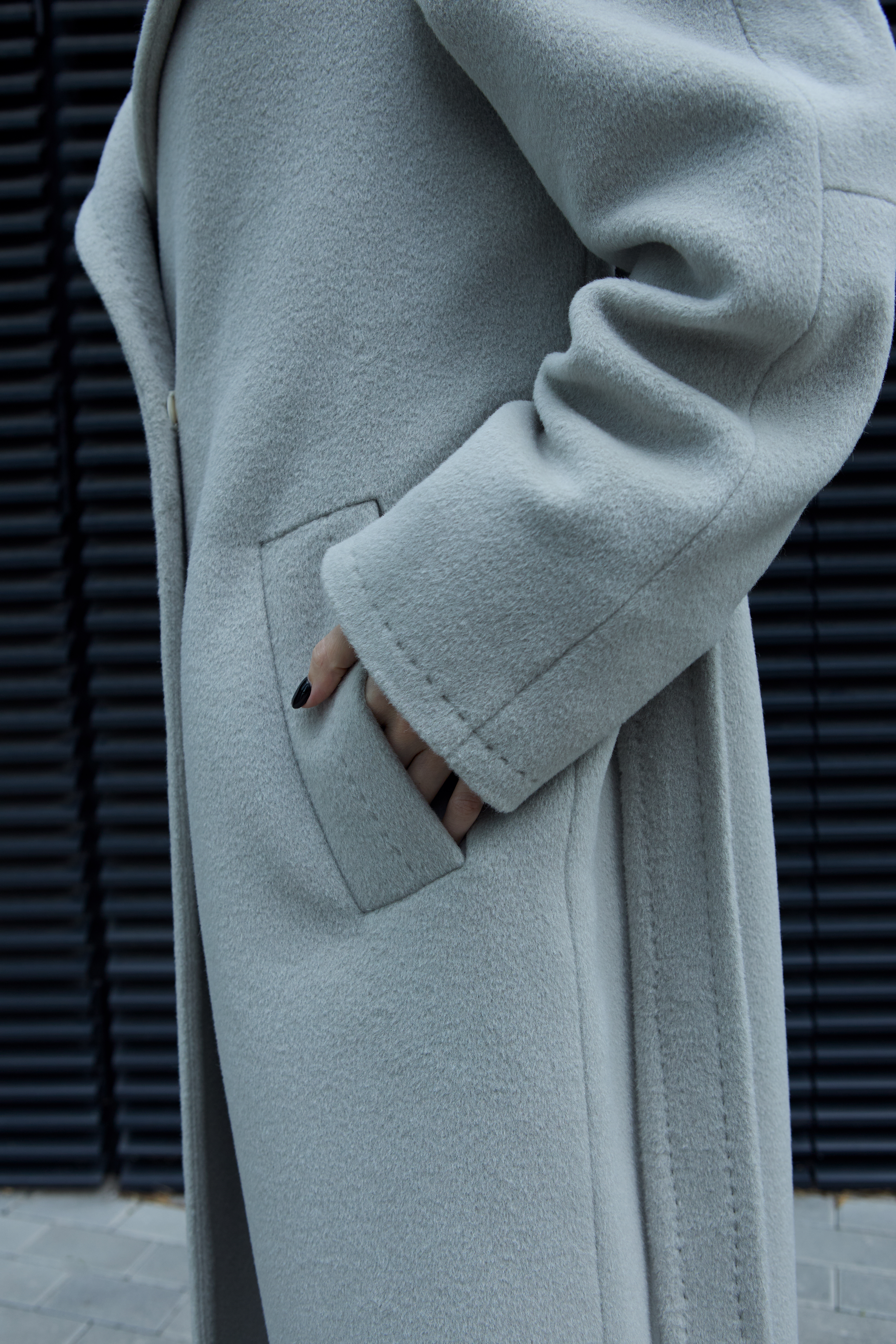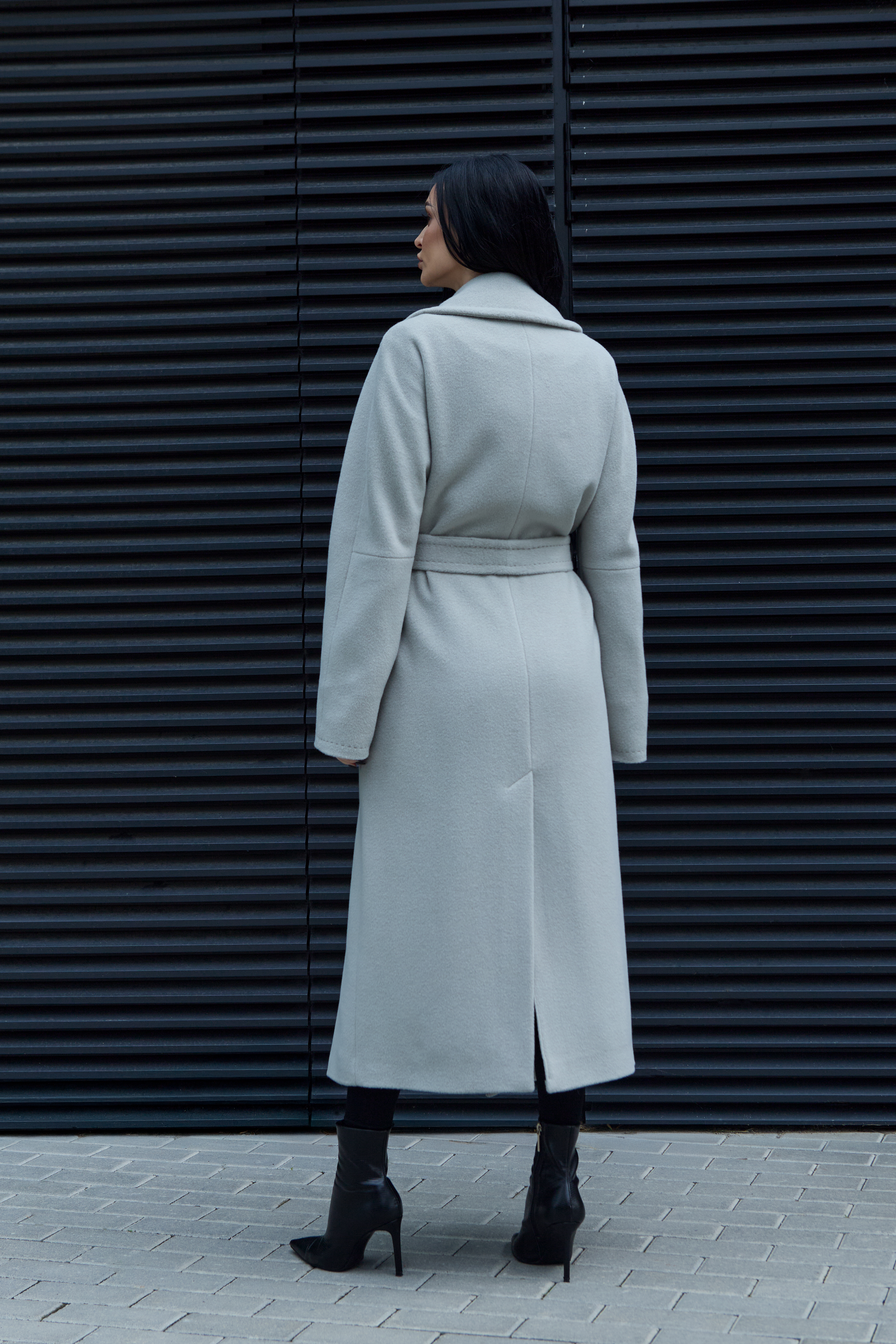 The coat includes semi-wool insulation — lightweight and thin, maintaining its structure while offering excellent thermal insulation and wind resistance, yet allowing the fabric to breathe. Semi-wool padding is used only in premium garments, as it is several times more expensive than other types of insulation. With its thermal insert, this coat is perfectly suited for the cold Lithuanian winter. When you press the alpaca wool fabric against your body in the cold, you will immediately feel its warmth.
