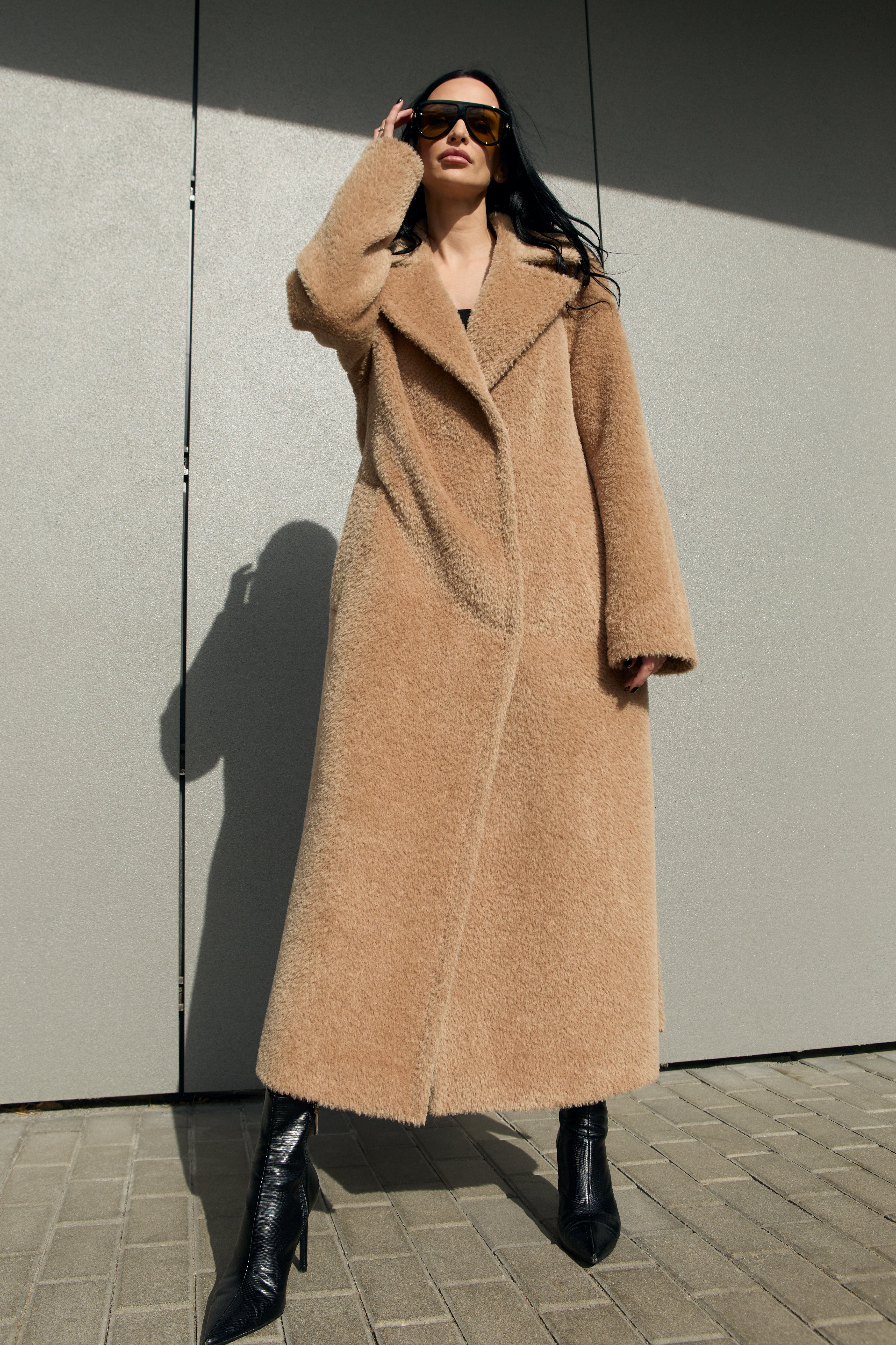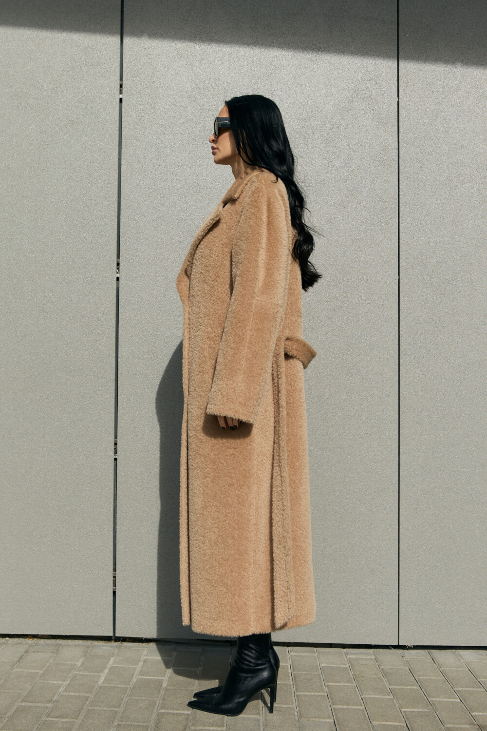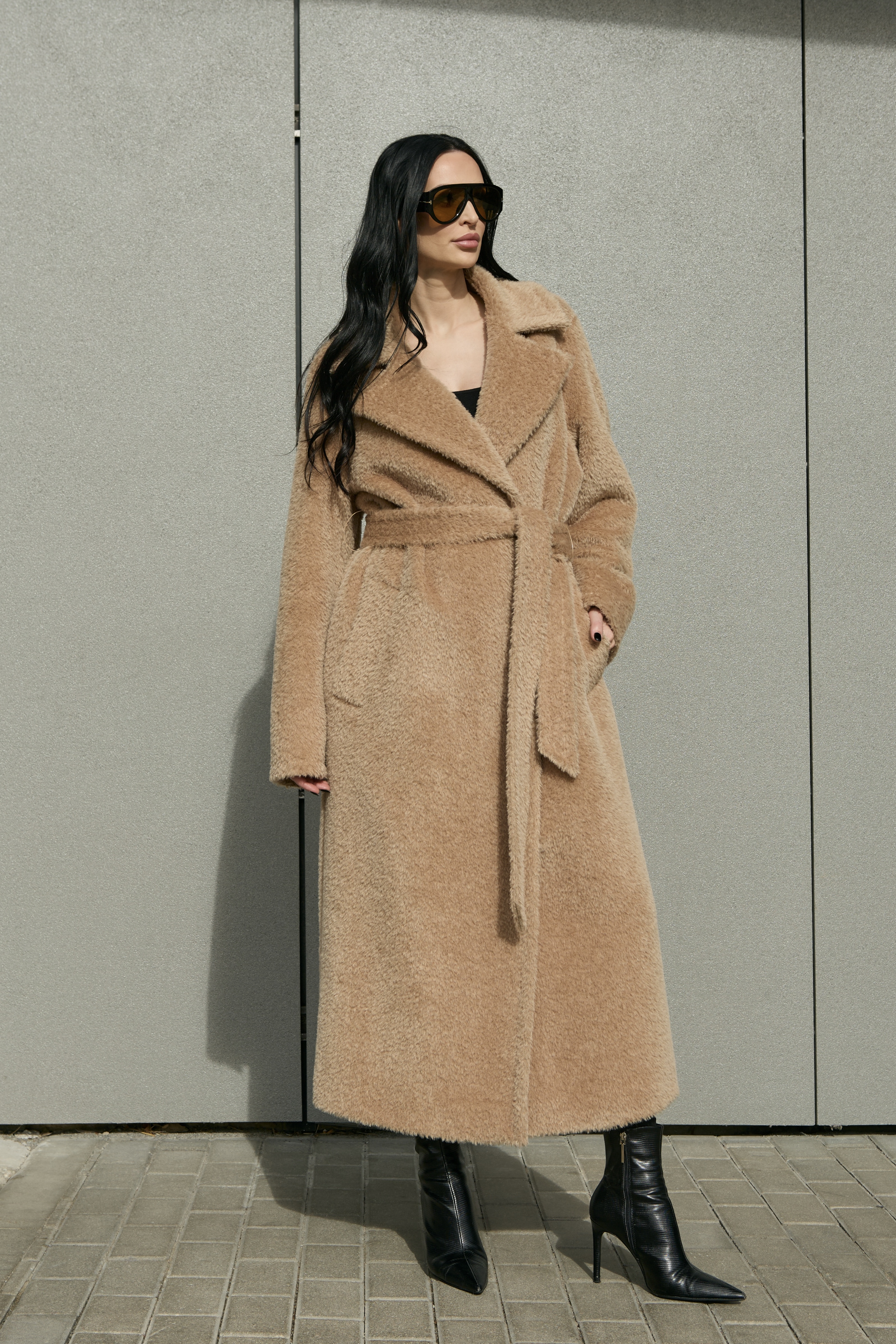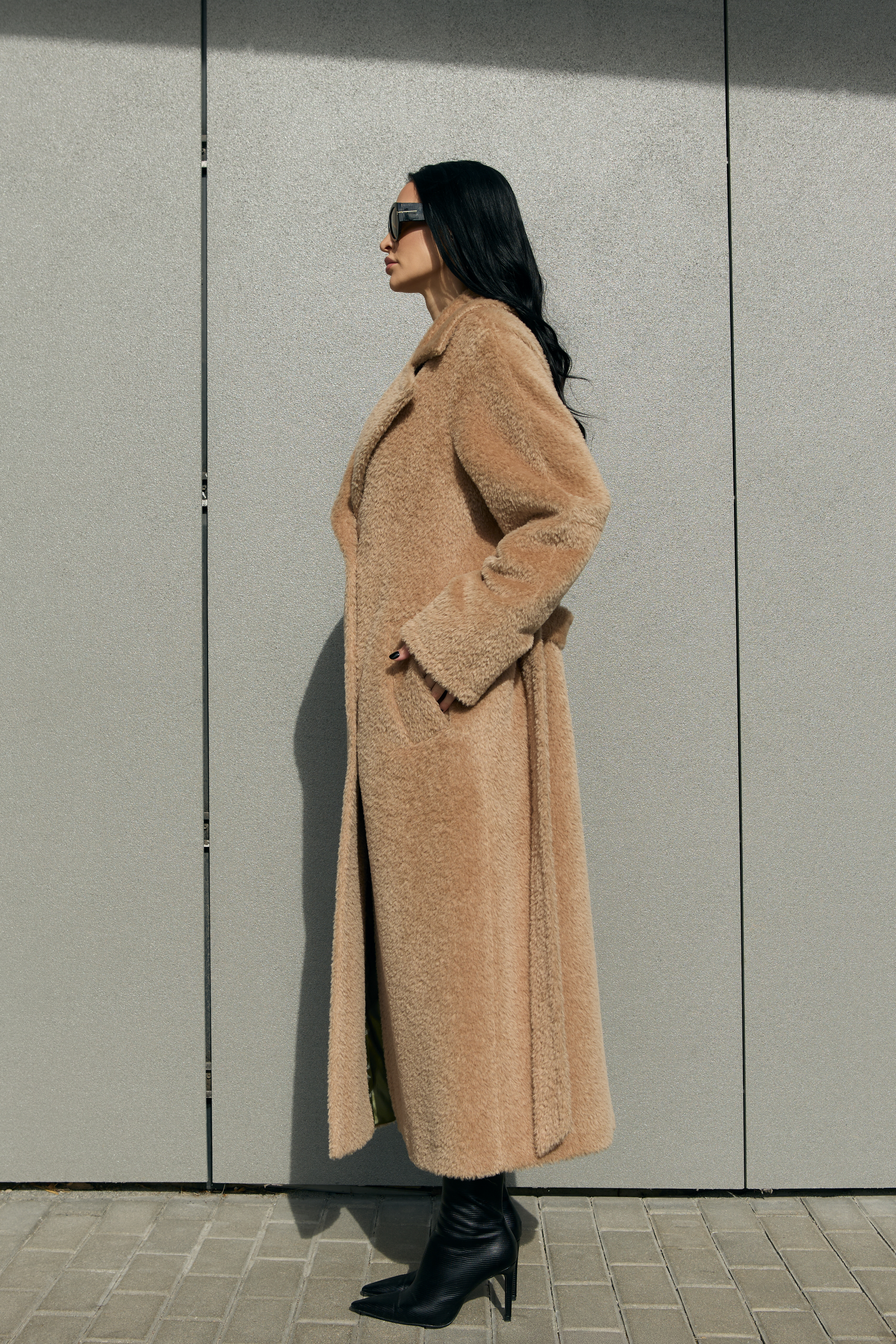 This is a high-quality Italian-made fabric, unique for its long pile and special weave. The fabric is woven so that the sheep’s wool lies underneath, while the long alpaca fibers are on the surface — creating an exceptionally warm and beautiful texture. The alpaca fibers are glossy, very soft, and smooth; the quality of the material can be felt with just one touch.