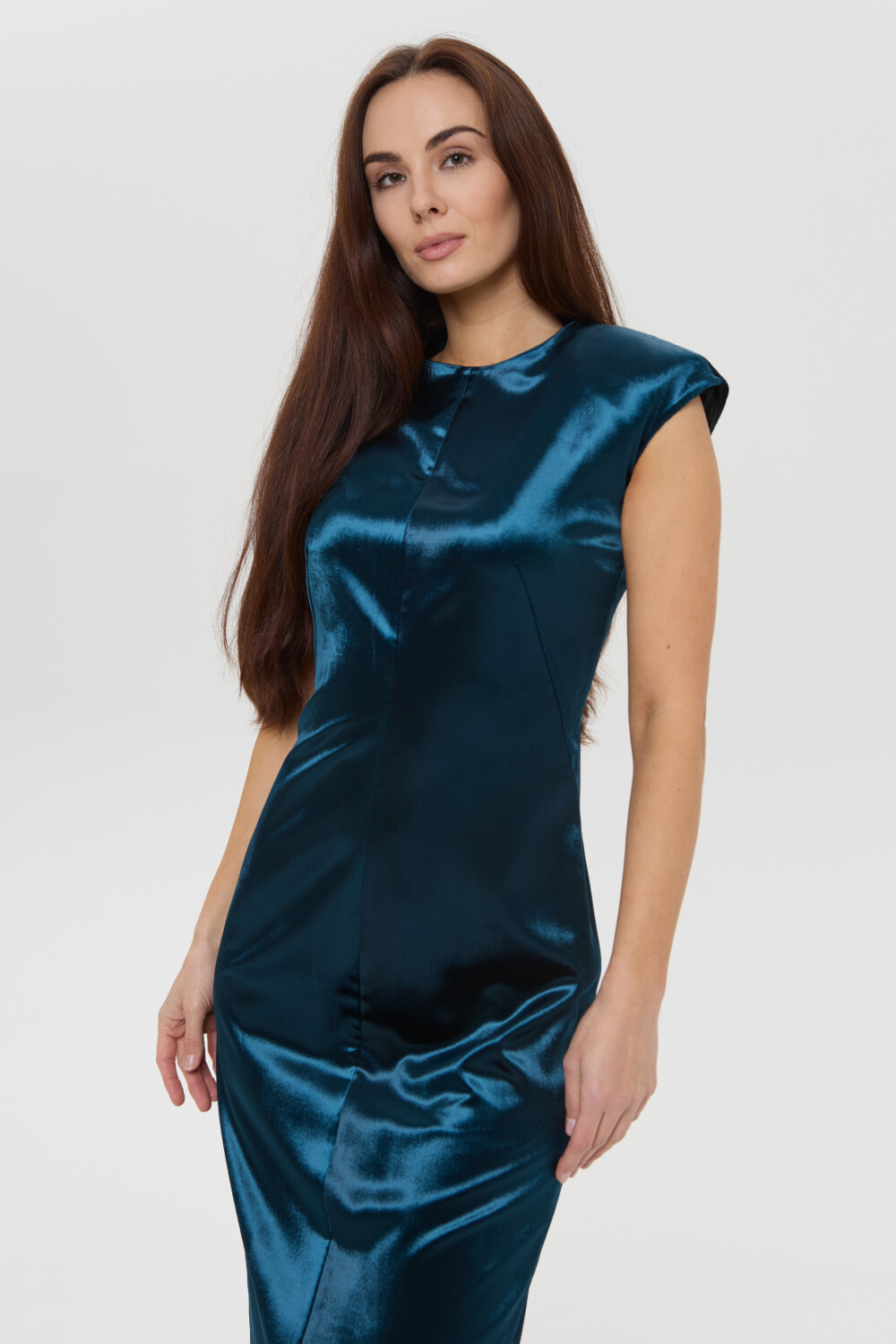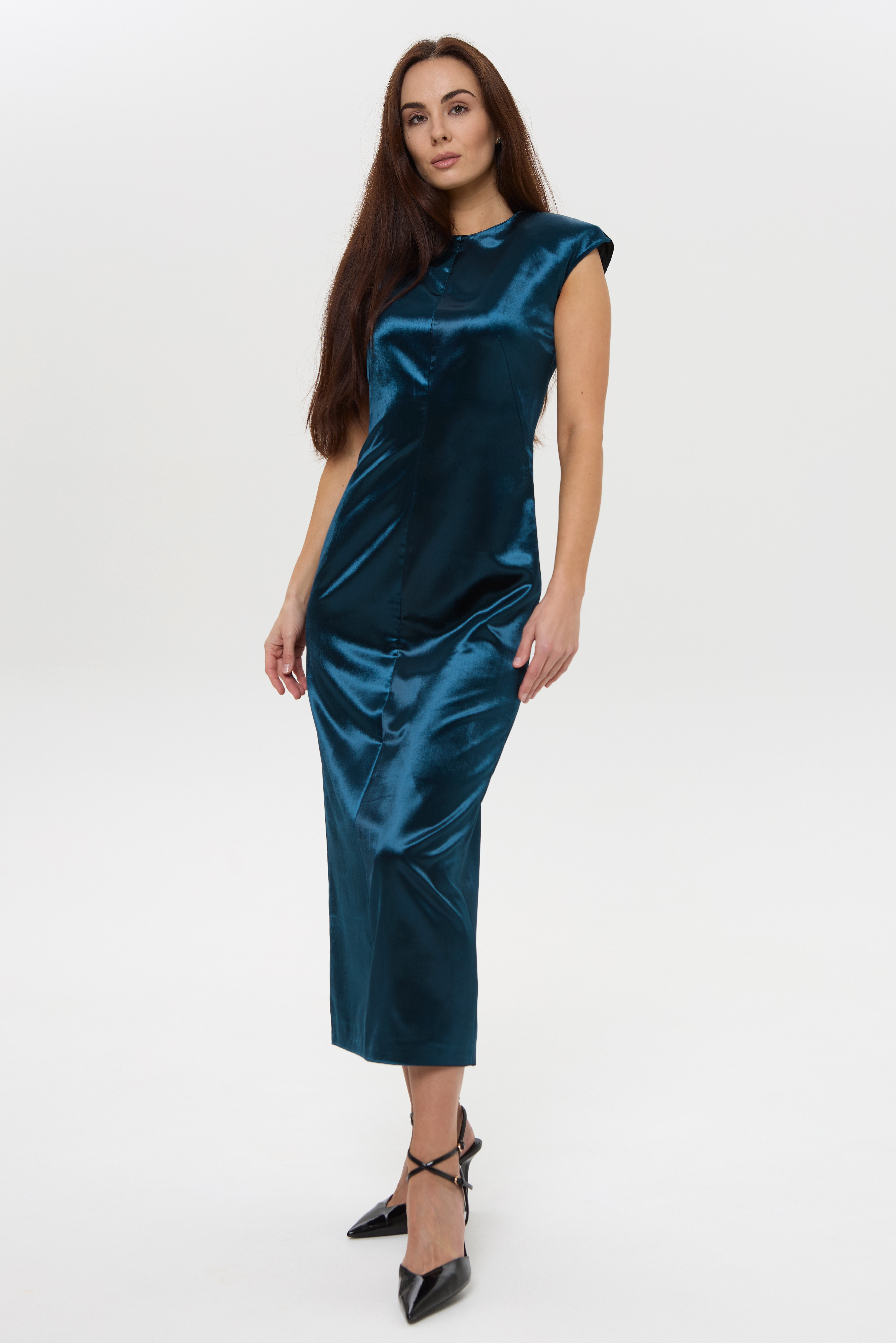 Suknelė pasiūta iš struktūriško, bet lengvai krentančio aksominio audinio, kuris išlaiko formą, bet leidžia kūnui judėti. Priklausomai nuo apšvietimo, audinio spalva subtiliai kinta, atskleisdama skirtingus mėlynus atspalvius. Nugaros linijoje paslėptas užtrauktukas, o subtilus skeltukas nugaroje suteikia lengvumo judesiui ir papildomos elegancijos. Jokio pertekliaus tik švarios linijos ir tiksliai apgalvoti akcentai.