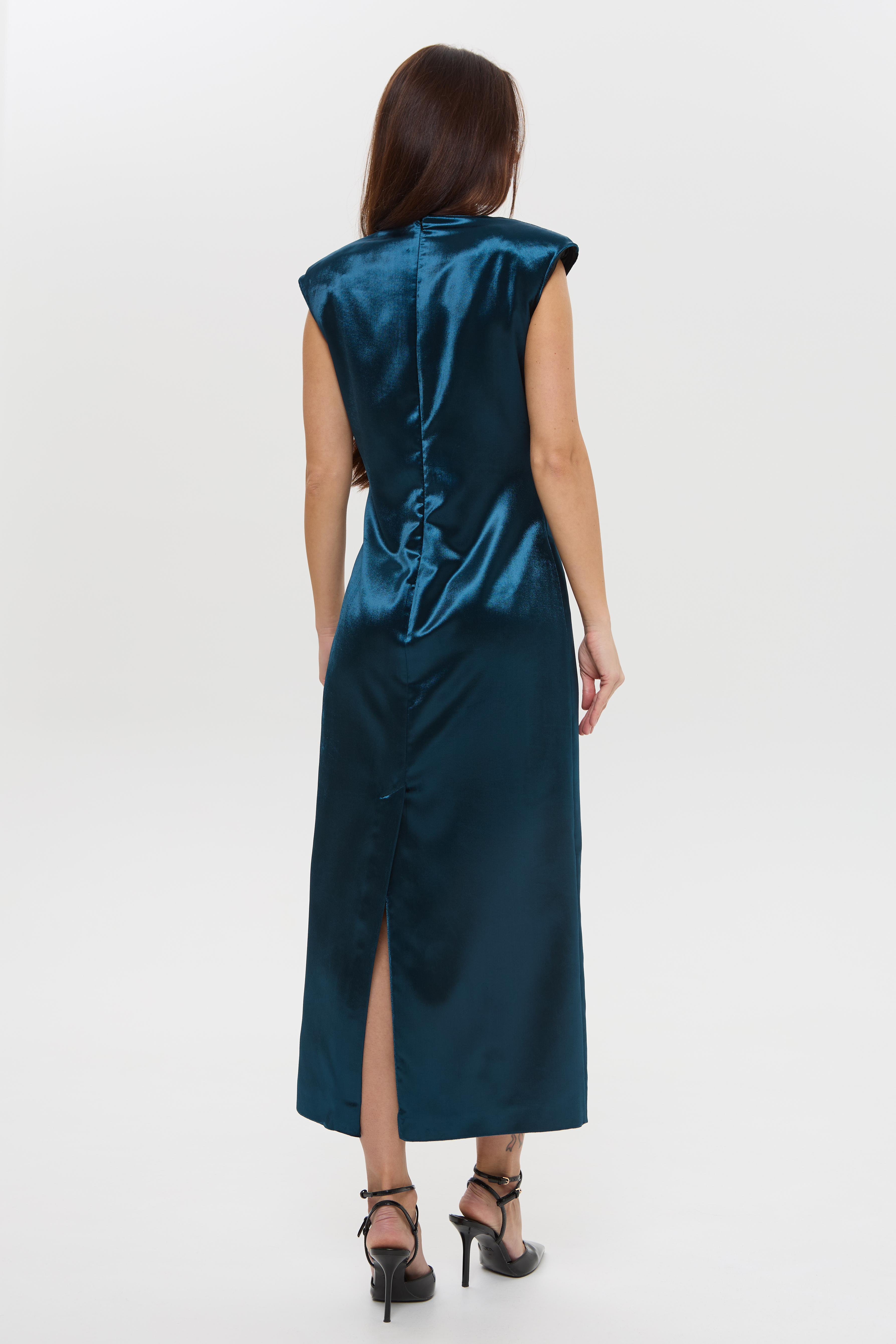 Ši minimalistinė mėlyna ilga aksominė suknelė kuria stiprų, bet rafinuotą įvaizdį. Ryškesni pečių akcentai sukuria architektūrišką proporciją, kuri vizualiai išryškina siluetą, suteikia figūrai struktūros ir elegantiško griežtumo.