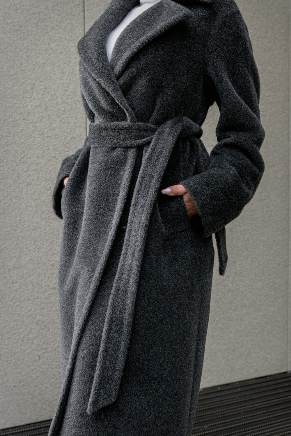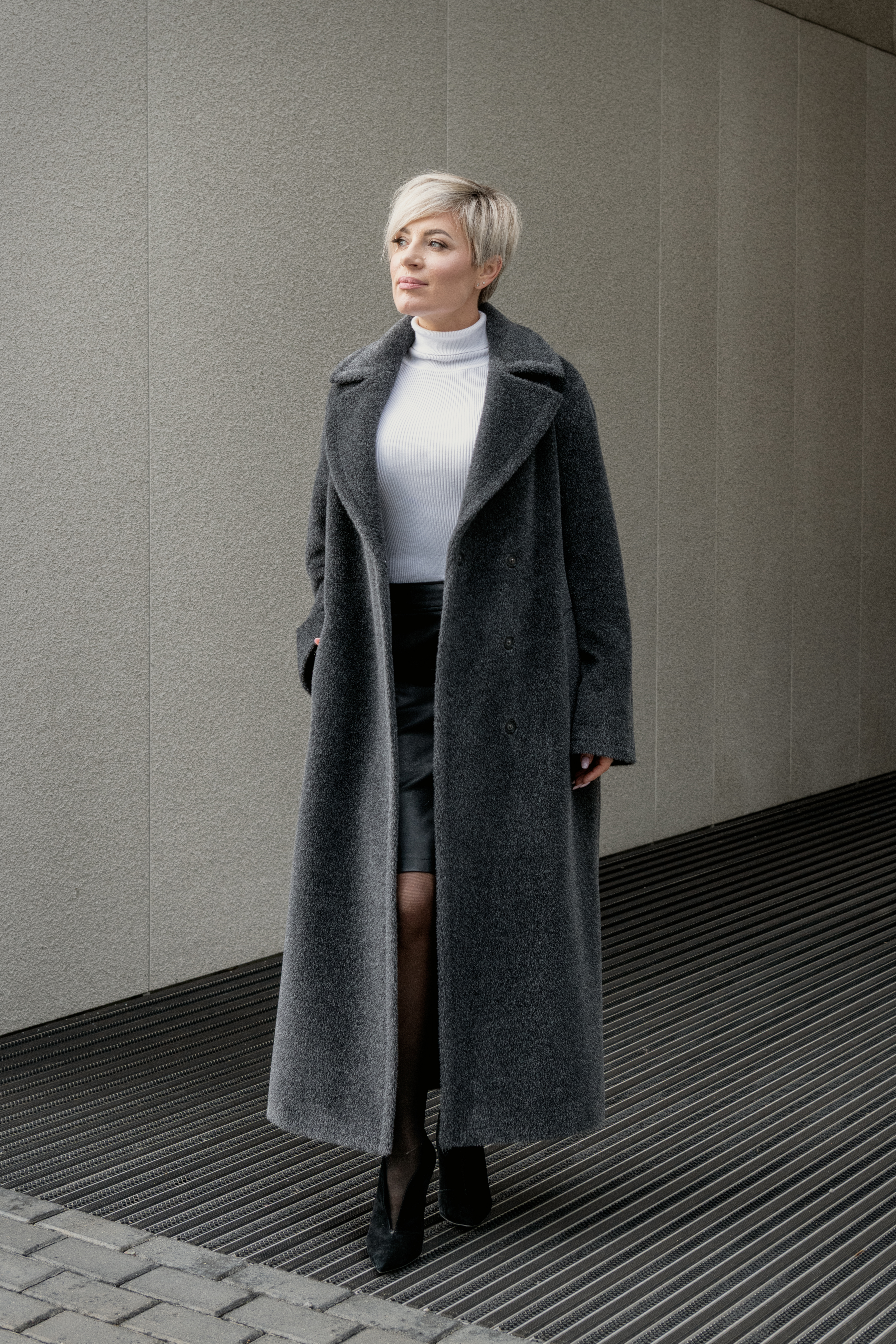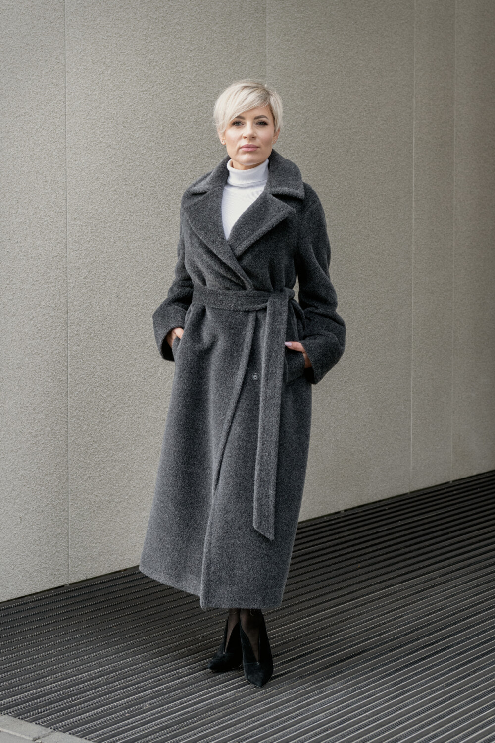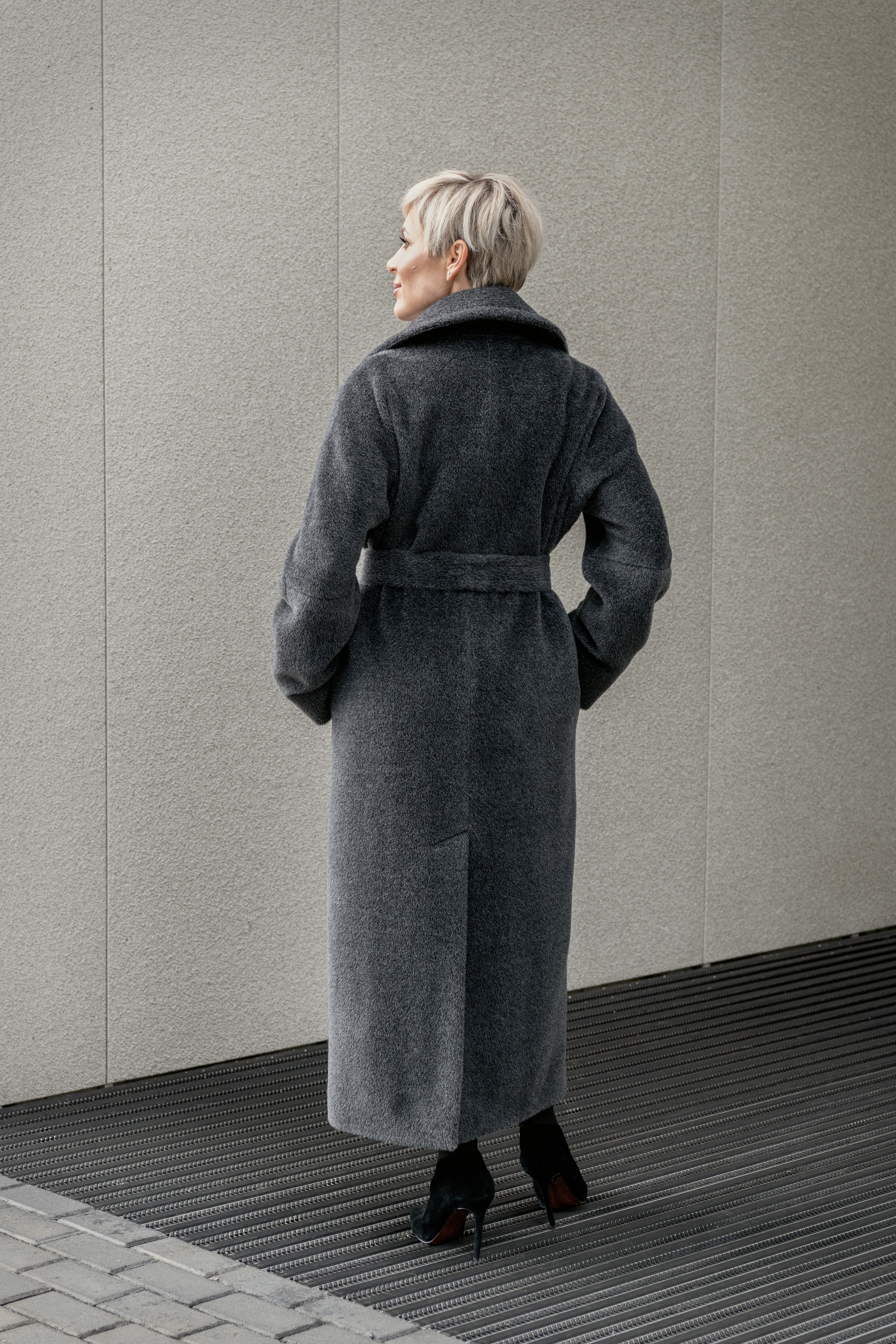 Ilgas, tiesaus silueto paltas su padidinta smailia klasikine apykakle suteikiančia elegantiškumo, bet nevaržančia, o reglano tipo rankovės suteikia laisvumo pojūtį, bei gerai atrodo ant įvairių apimčių pečių linijų. Paltas susagstomas metalinėmis spaudėmis ir užjuosiamas diržu to paties audinio.