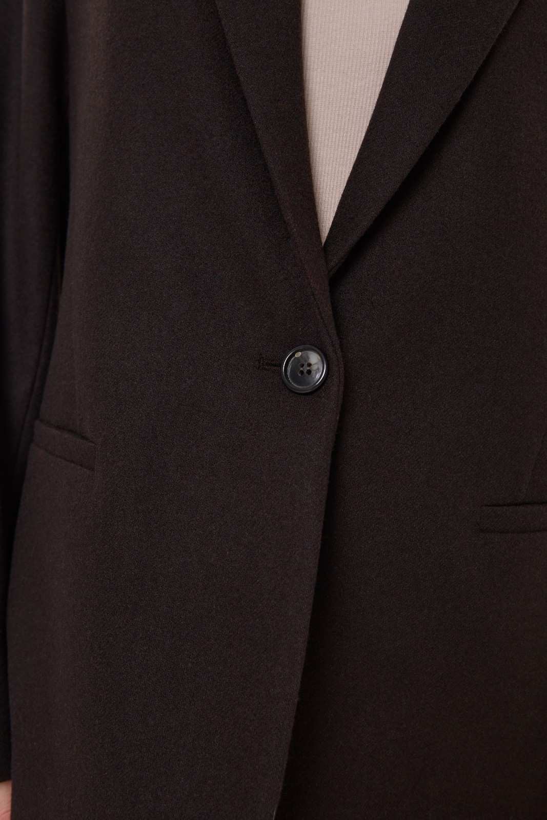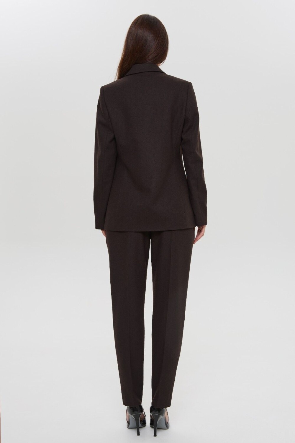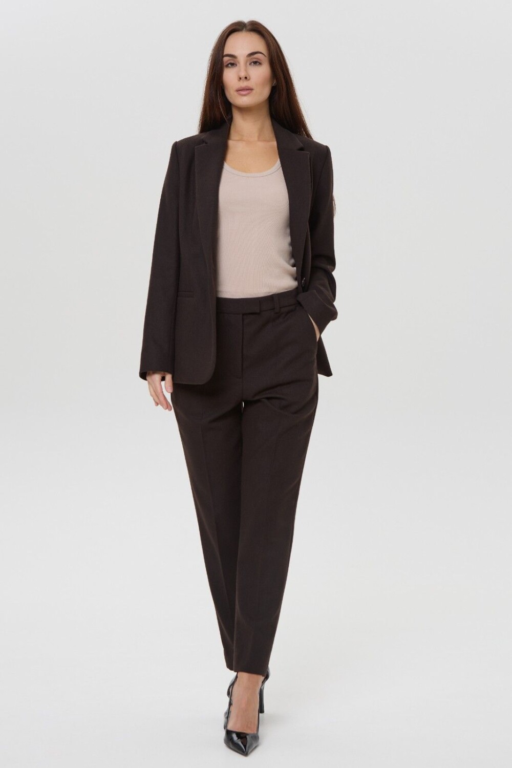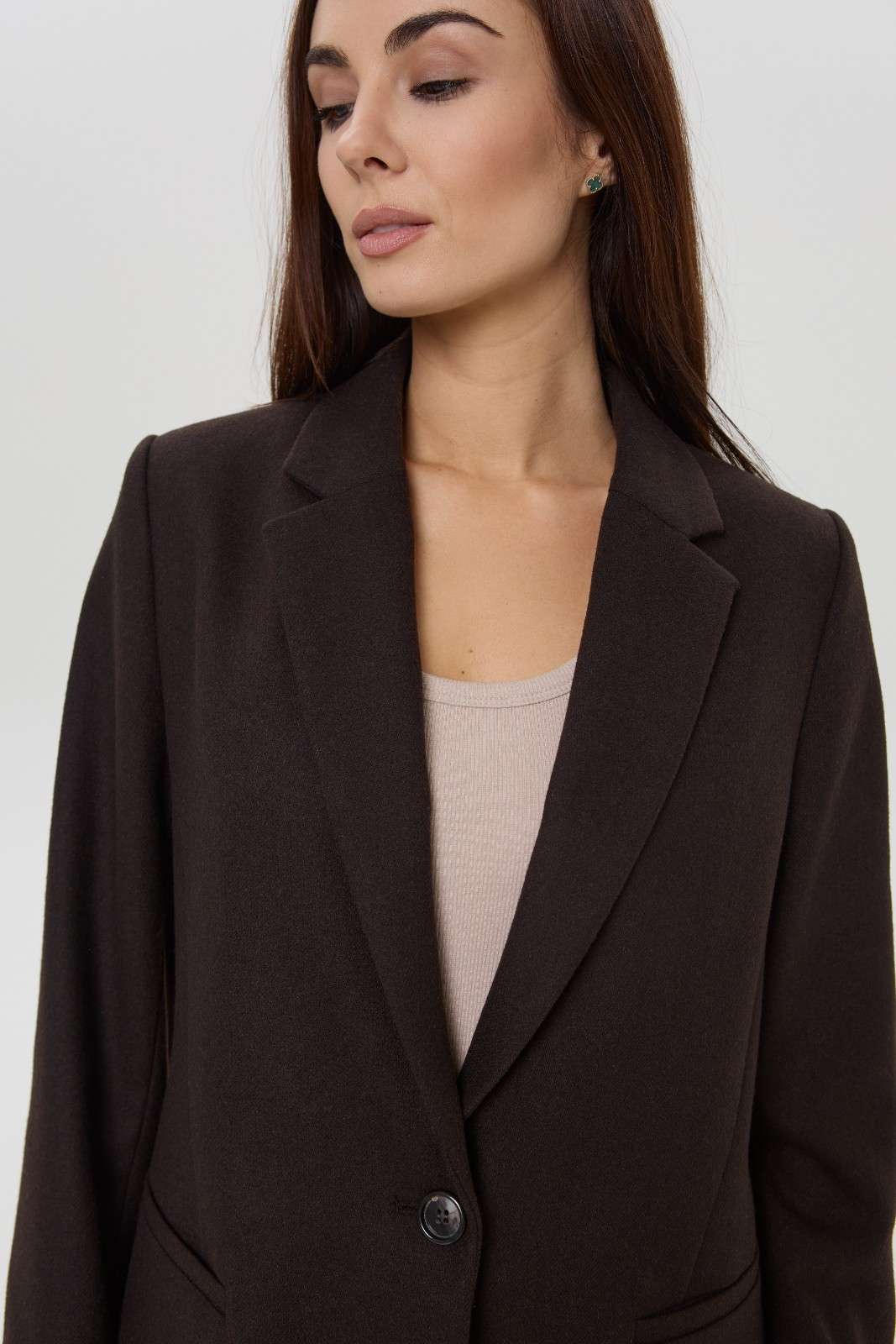Elegantiškas šokoladinės rudos spalvos švarkas modernios klasikos pasirinkimas. Tiesaus silueto modelis subtiliai formuoja figūrą ir suteikia įvaizdžiui solidumo. Klasikinė atvartų apykaklė, vienos sagos užsegimas ir praktiškos kišenės kuria laikui nepavaldų dizainą.