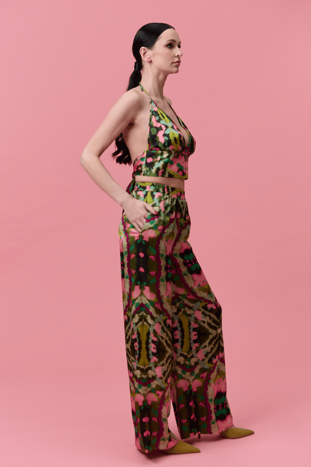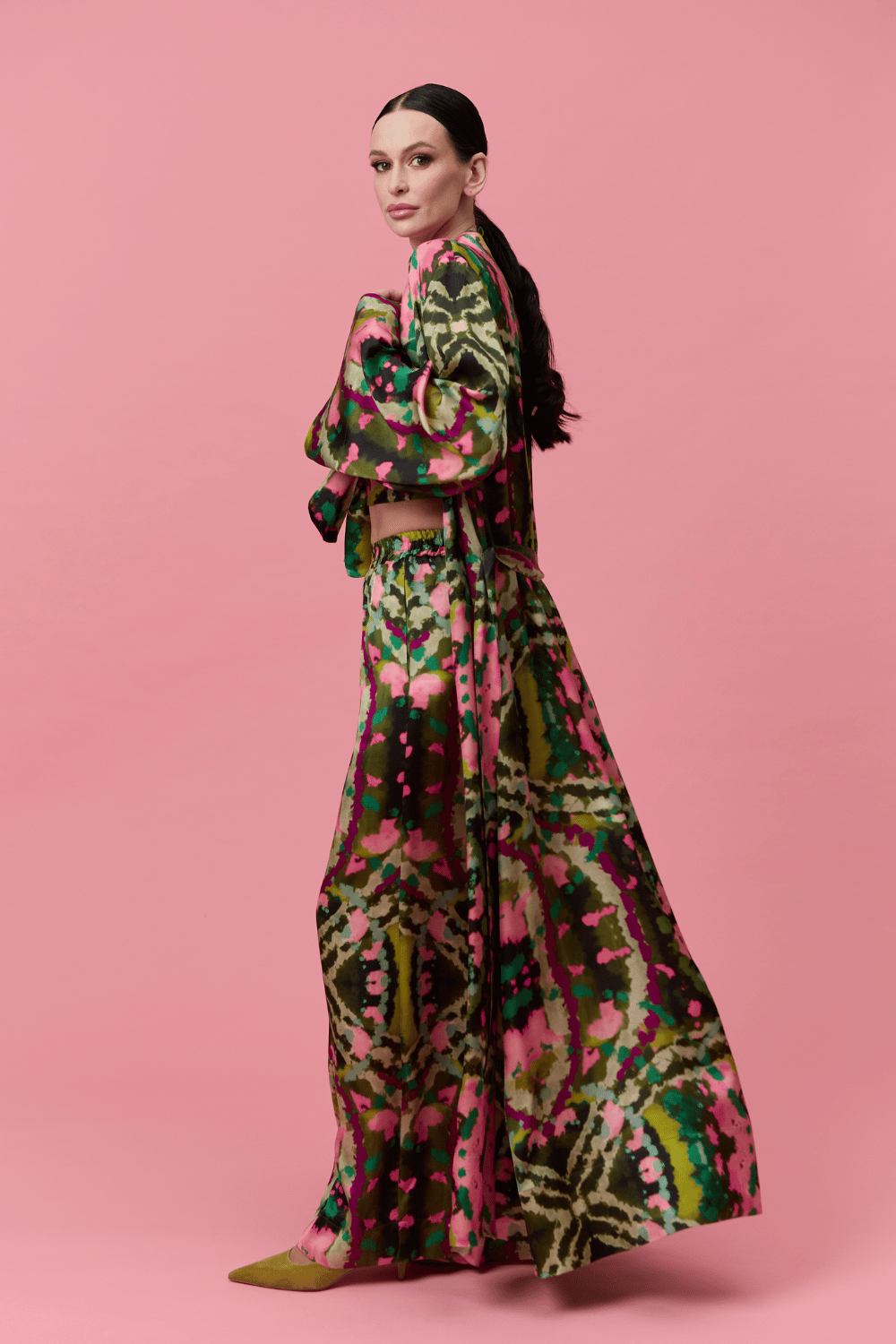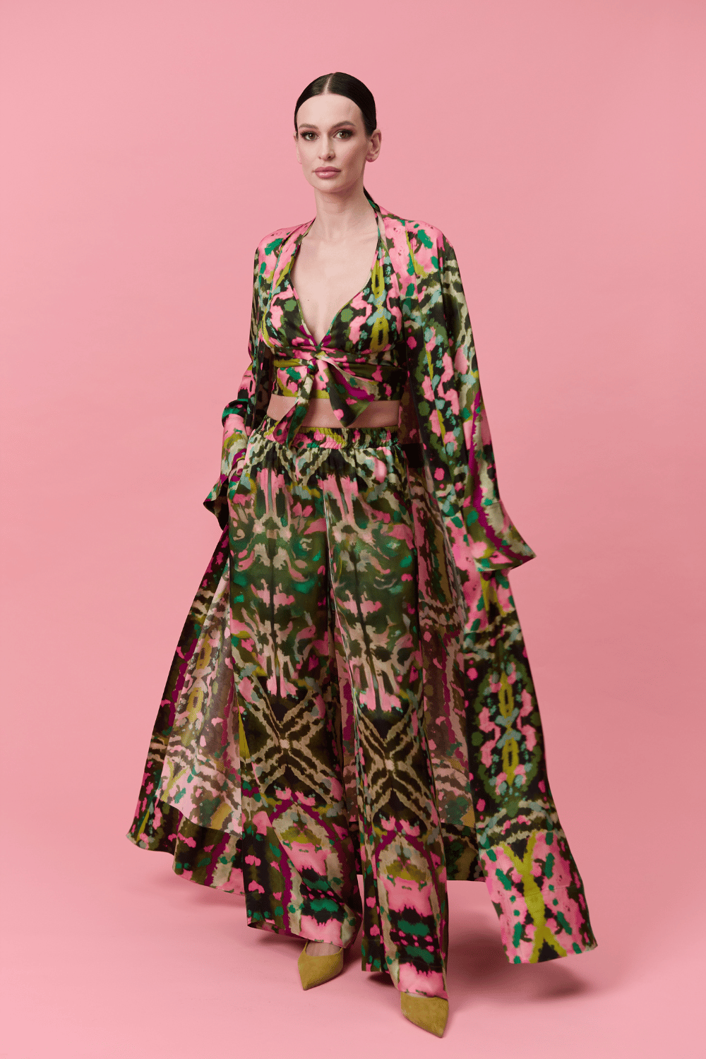 Išskirtinio tropical raštas spinduliuoja subtilią egzotiką ir rafinuotą moteriškumą. Kruopščiai apgalvotas siluetas, elegantiškai krintančios, plačios kelnės, lengvai surišama palaidinė su giliu iškirpimu ir atvira nugara, bei lengvas, plazdantis penuaras, kuris kuria harmoningą, prabangų įvaizdį. Tai drabužis, leidžiantis jaustis ypatingai tiek namų jaukume, tiek atostogaujant prie jūros.