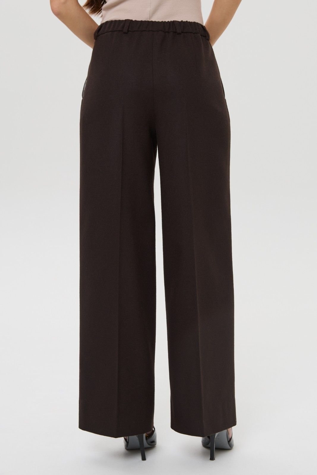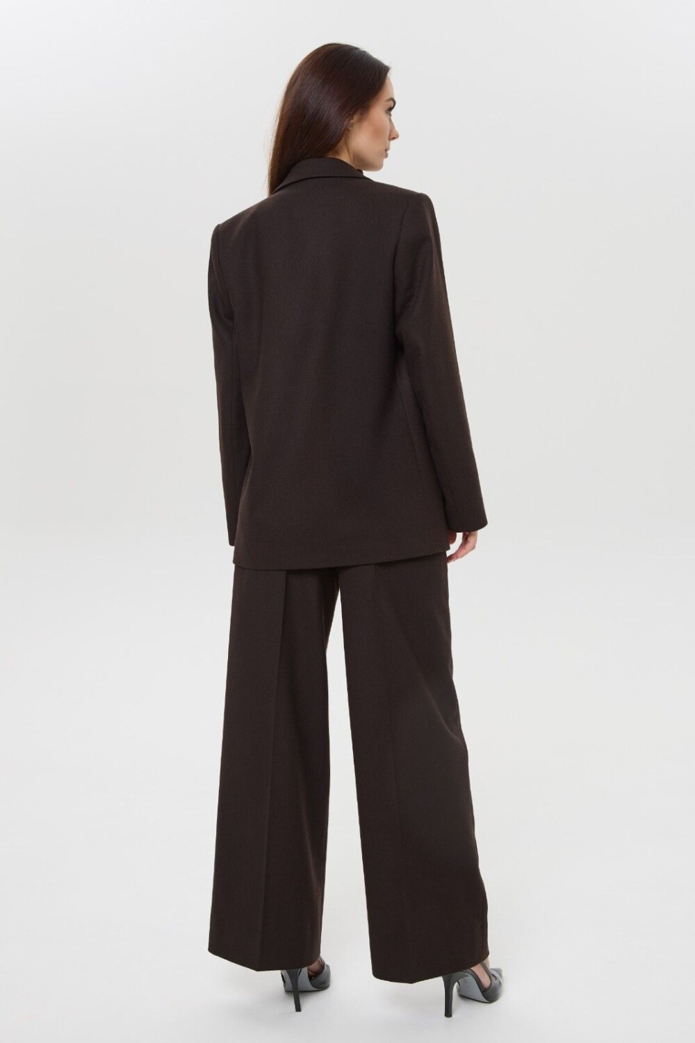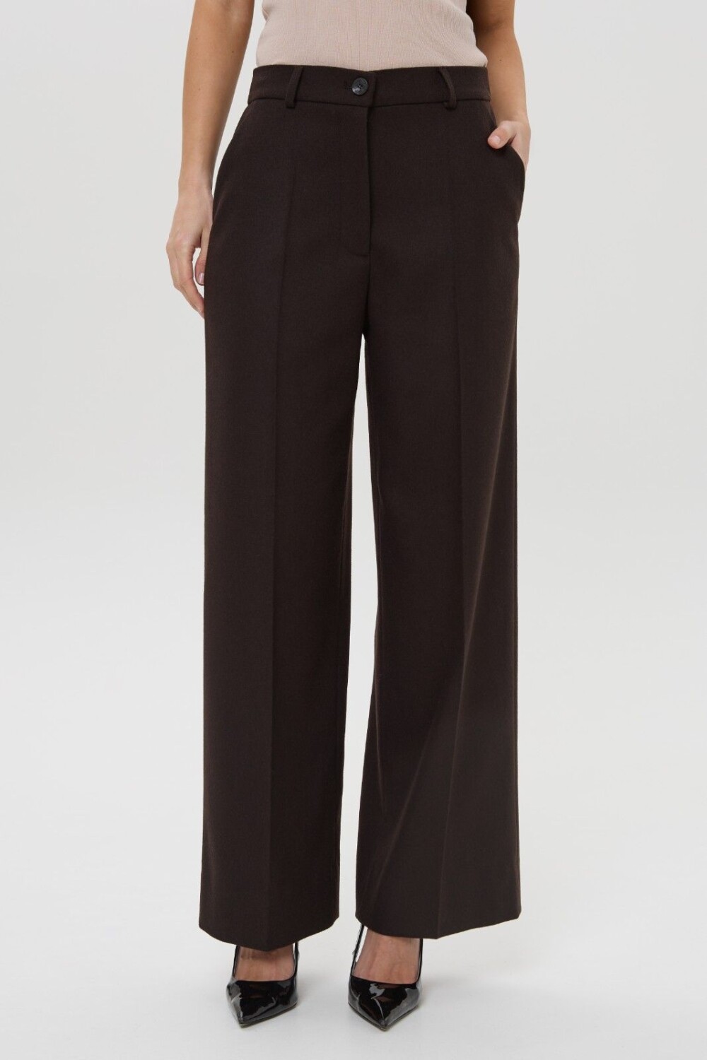 Šios klasikinės vilnonės kelnės pasižymi subtilia elegancija ir nepriekaištinga forma. Tiesaus, šiek tiek platėjančio silueto modelis vizualiai ilgina kojas ir suteikia įvaizdžiui struktūros bei modernumo. Priekyje išryškintos kantų linijos pabrėžia tvarkingą, architektūrišką charakterį.