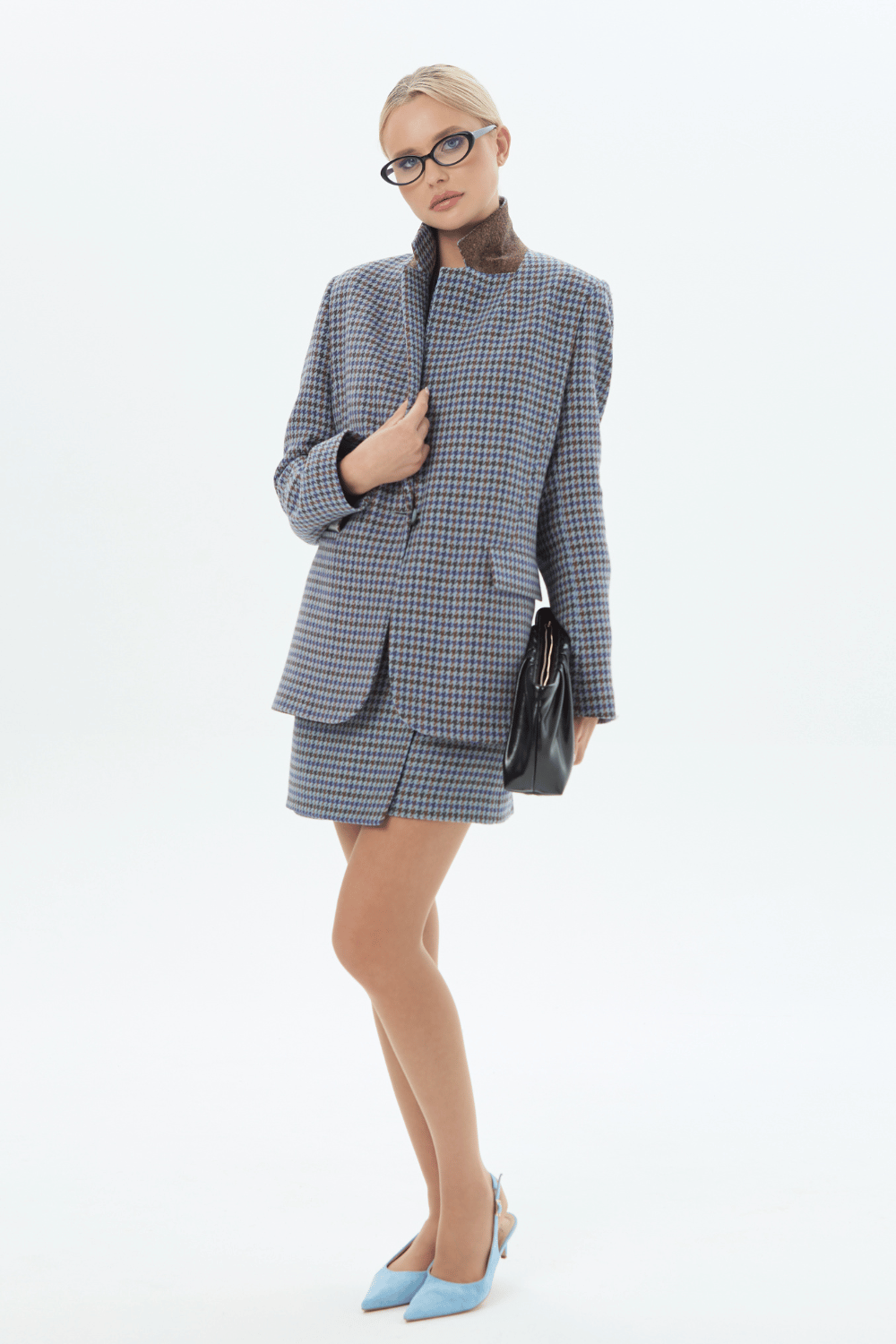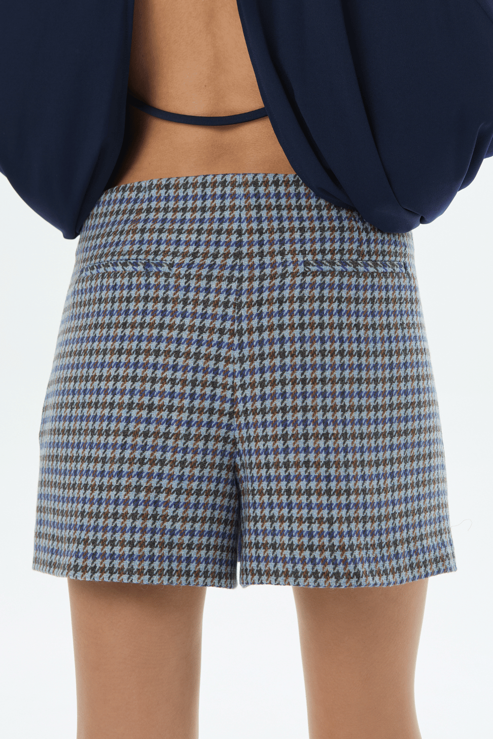Trumpas sijonas–šortai su subtiliu dirželiu priekyje tai rafinuotas pasirinkimas moteriai, vertinančiai stilių ir patogumą. Klasikinio rašto audinys suteikia įvaizdžiui struktūros ir charakterio, o integruotas dirželis dailiai pabrėžia liemenį bei kuria išskirtinį akcentą.
