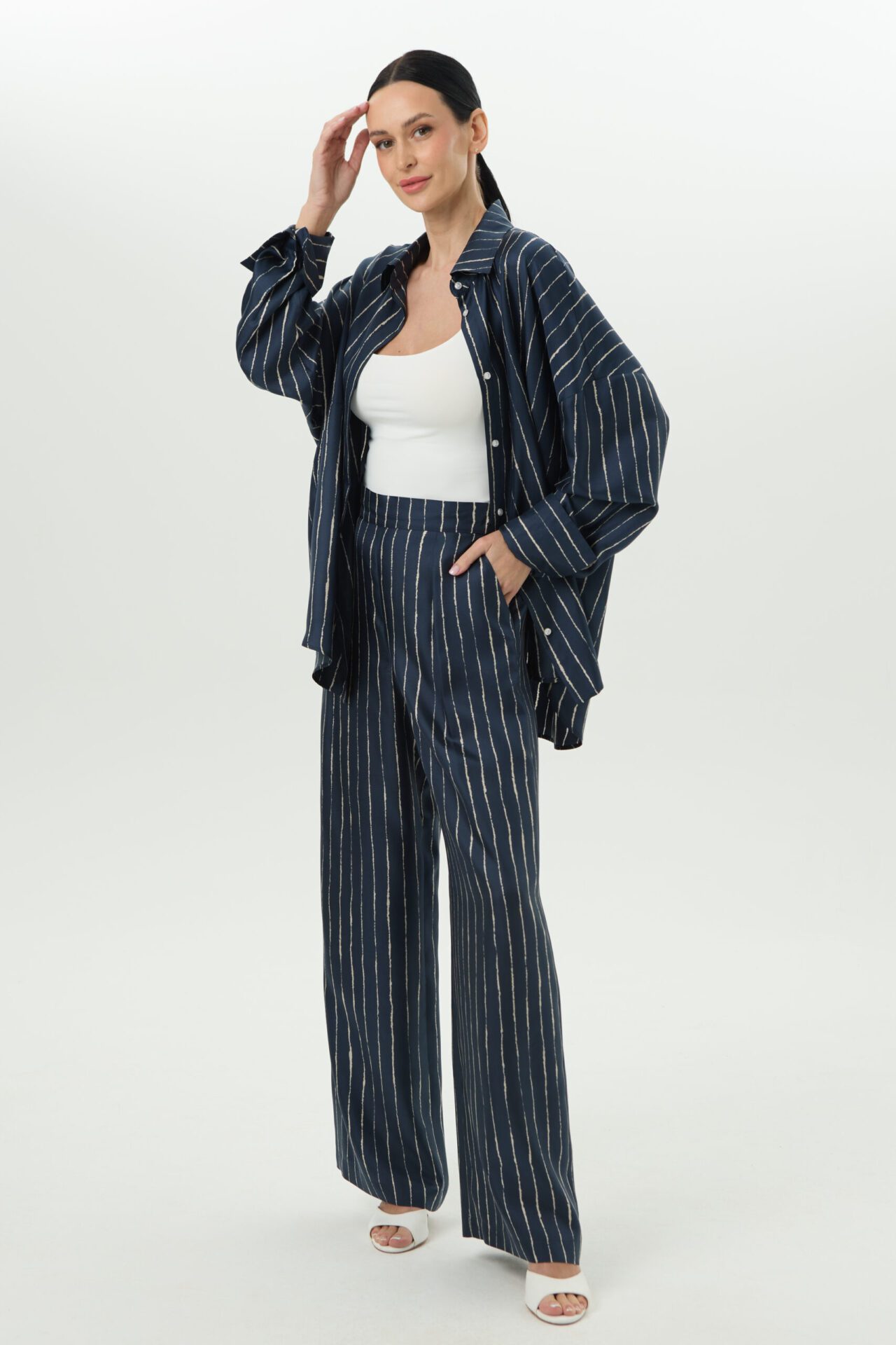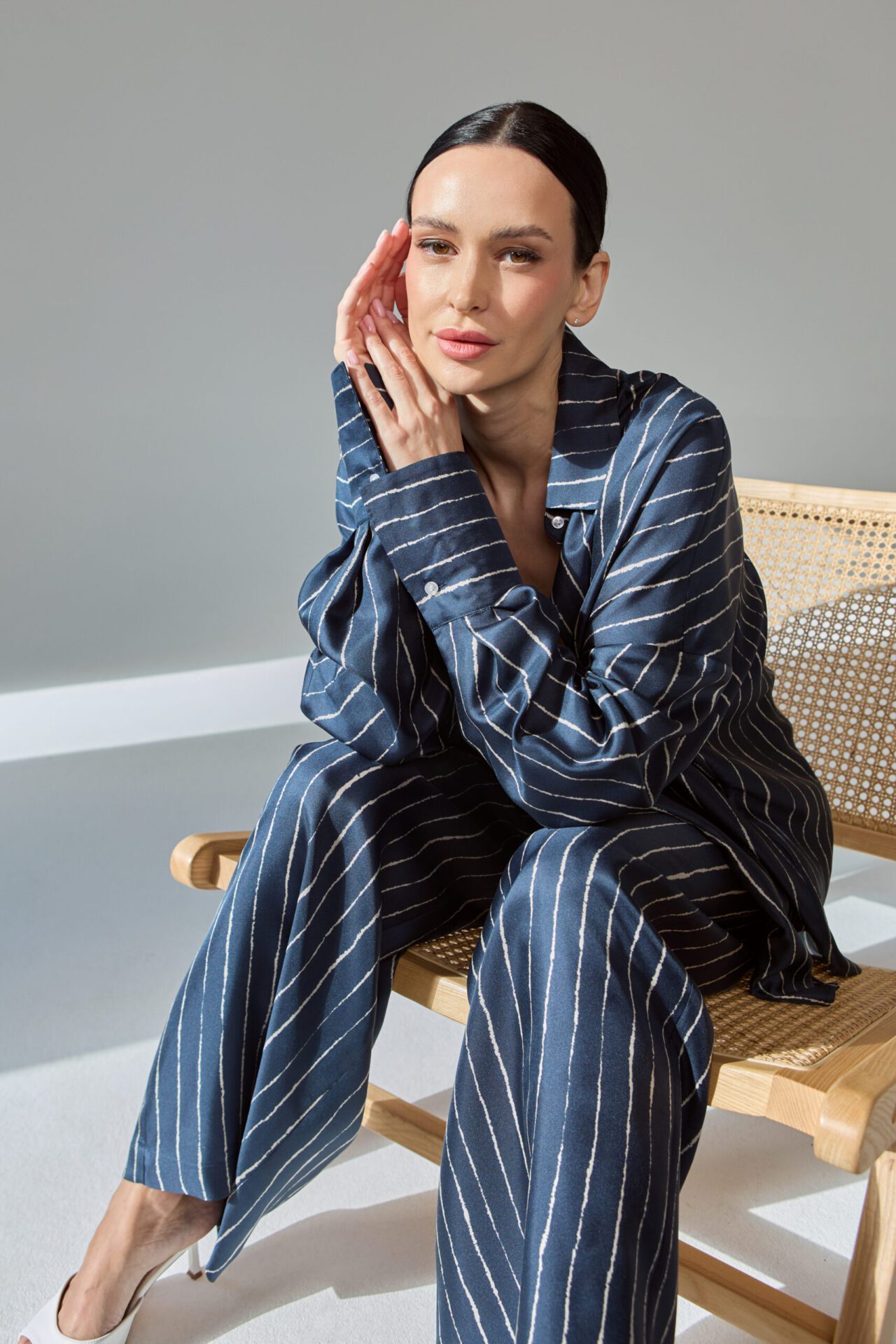 Šis kostiumėlis spinduliuoja prabangą. Lengvas, kvėpuojantis natūralus šilkas švelniai gula ant kūno, o gilaus, šiek tiek retro atspalvio tamsiai mėlyna spalva išskiria iš minios, tačiau išlieka elegantiškai santūri.